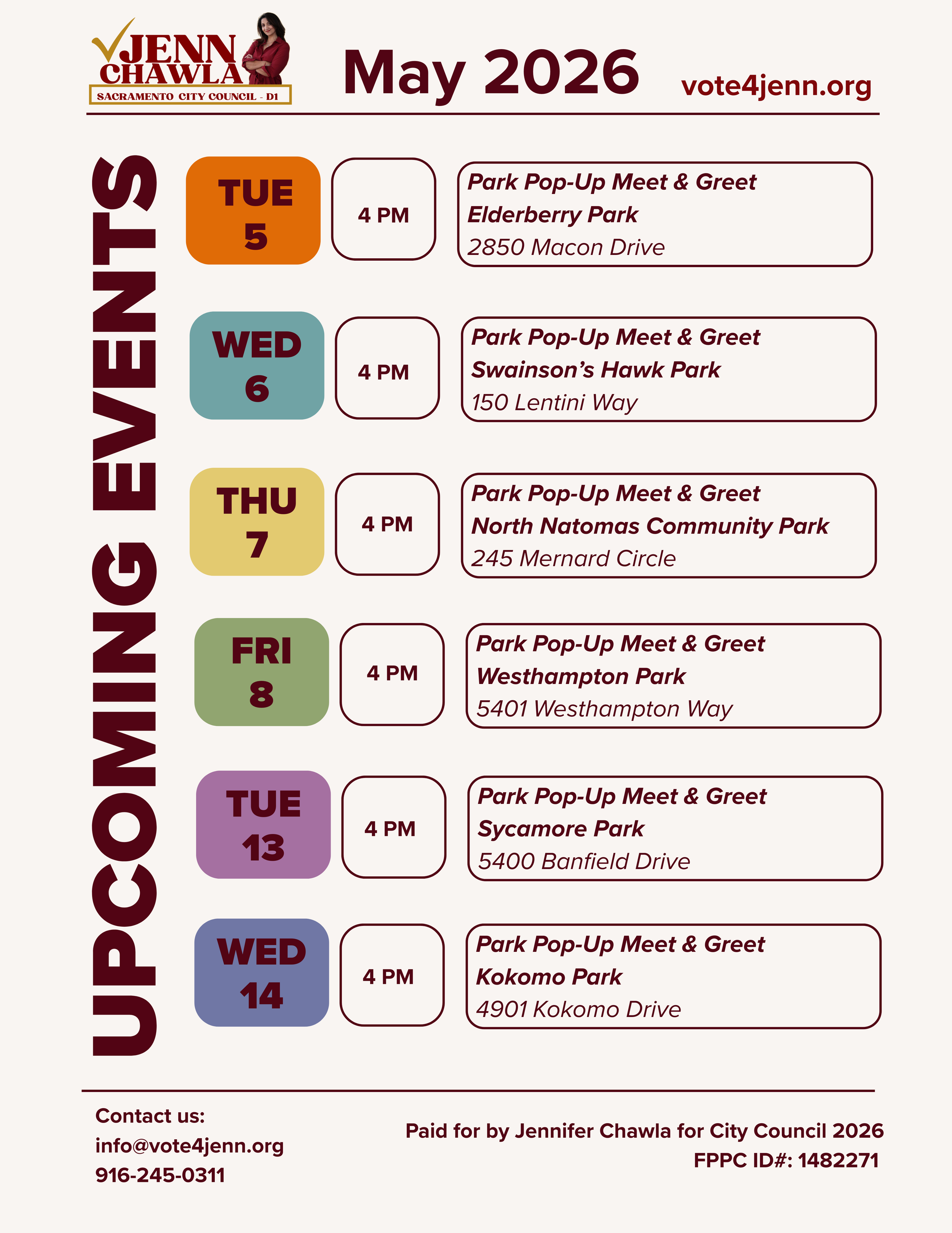 Did you know that District 1 has more parks than any other district in the city of Sacramento? Join Jenn for a casual, drop-in meet and greet at each of the 29 parks in District 1. This is an open, informal space for neighbors to stop by, say hello, and share what’s on their mind.