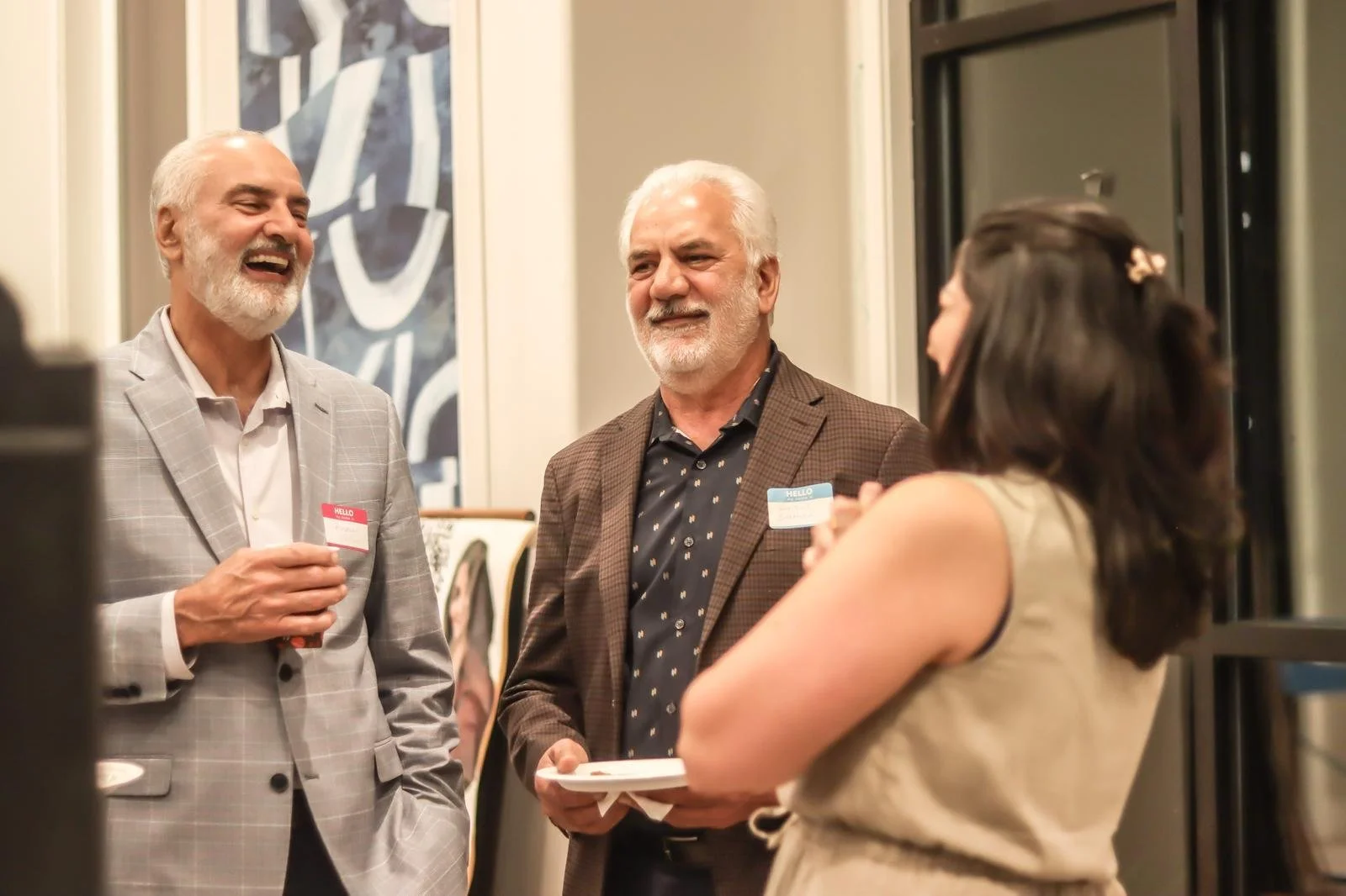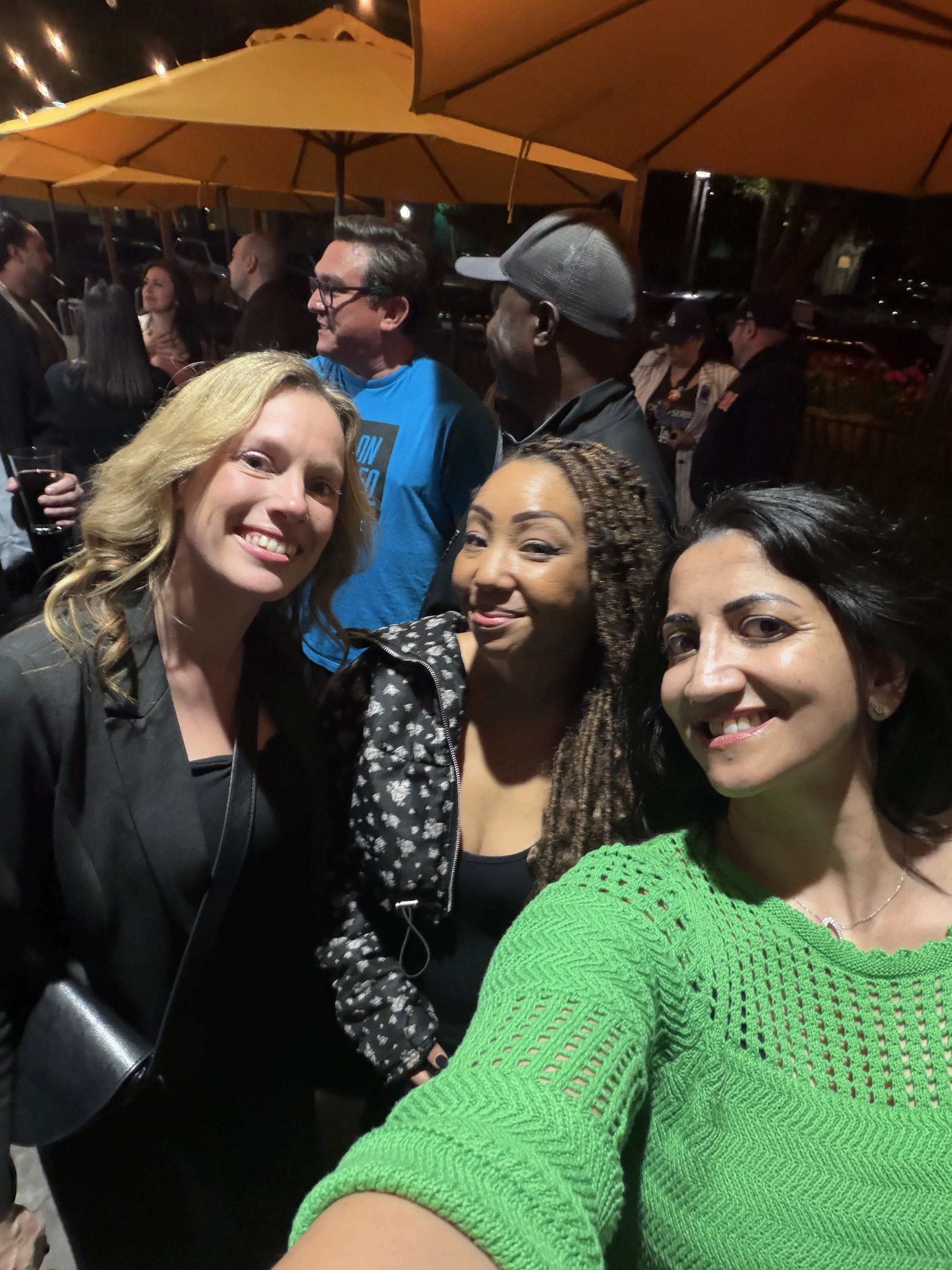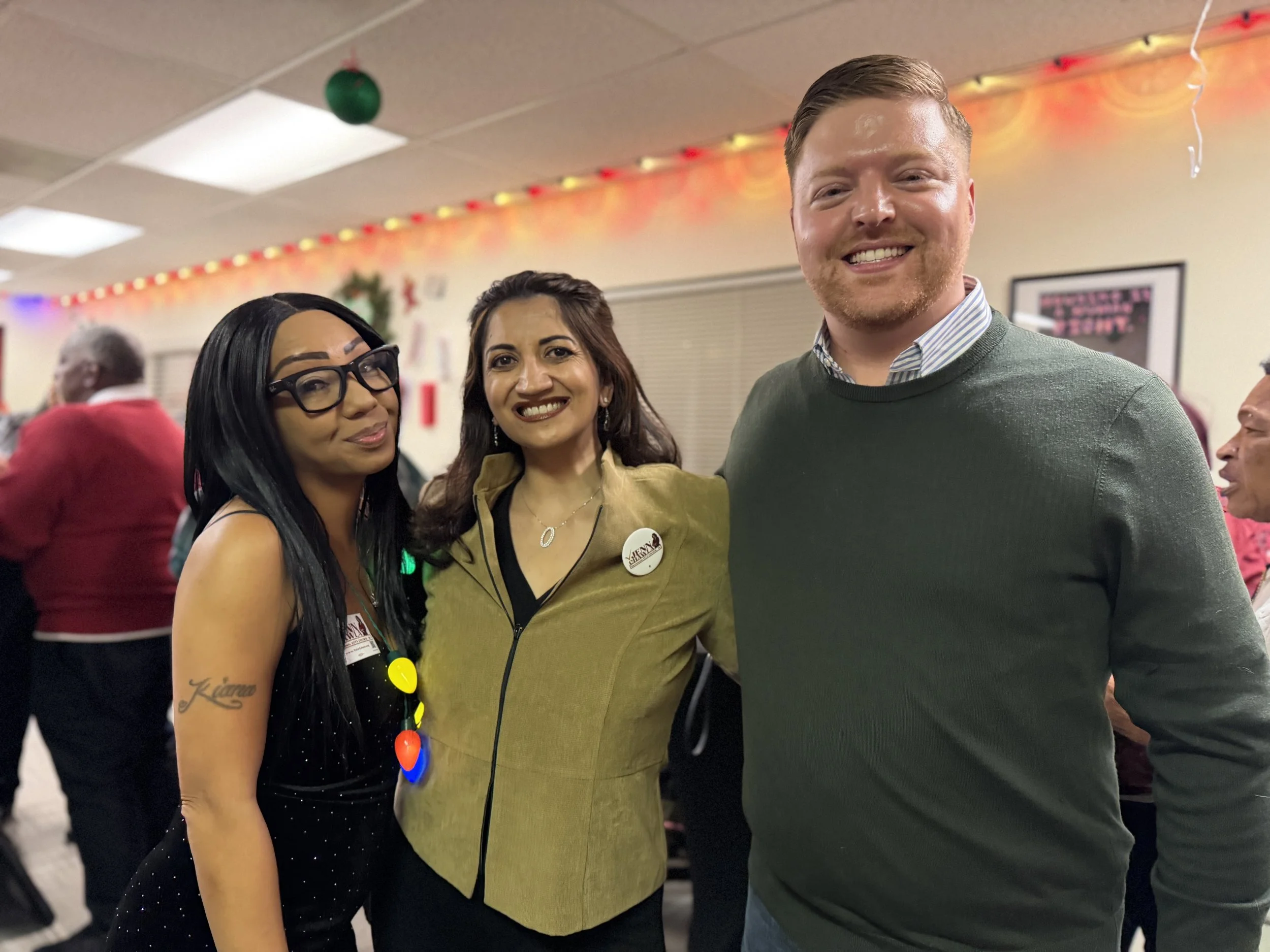 Three individuals posing for a photo at a social or professional event in a warmly decorated room, with other people in the background.