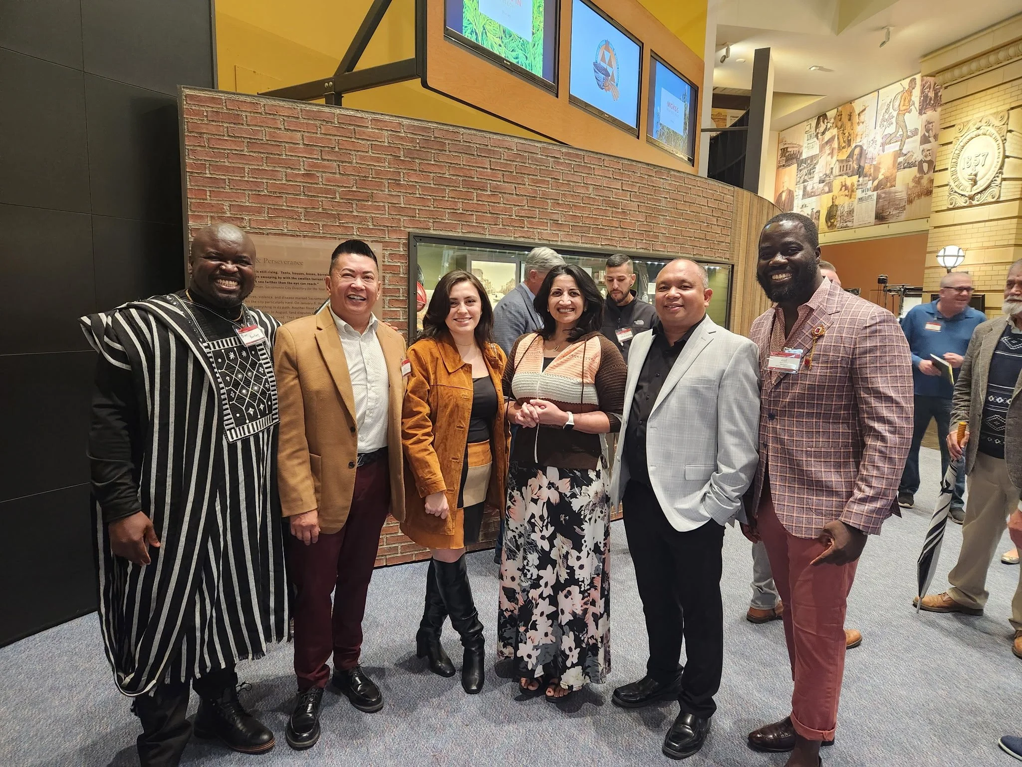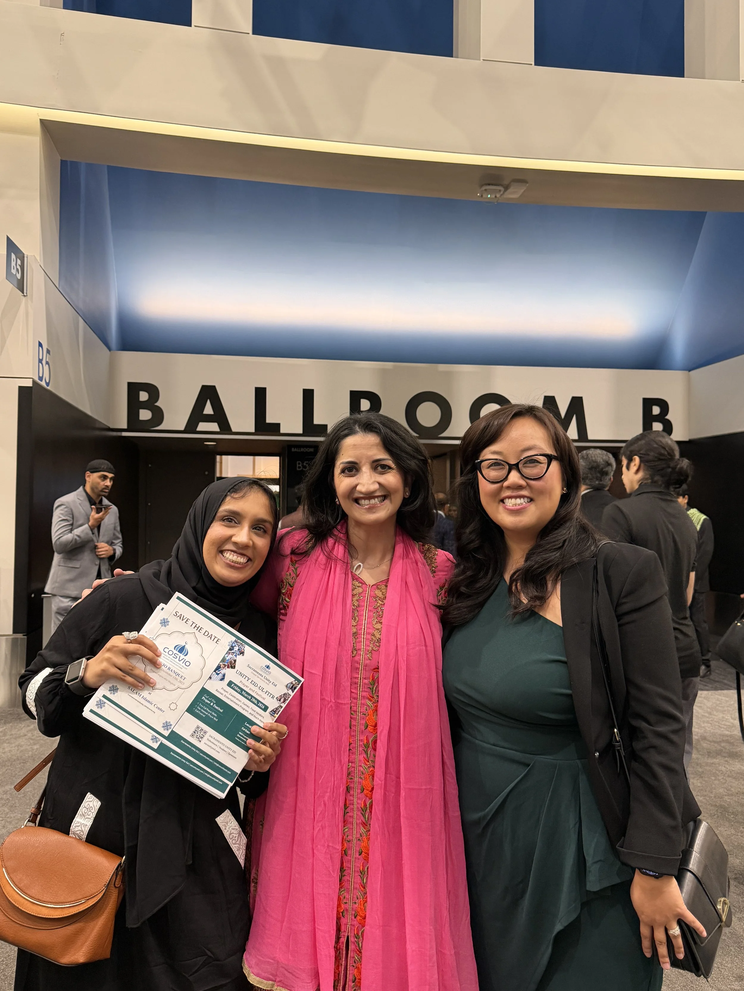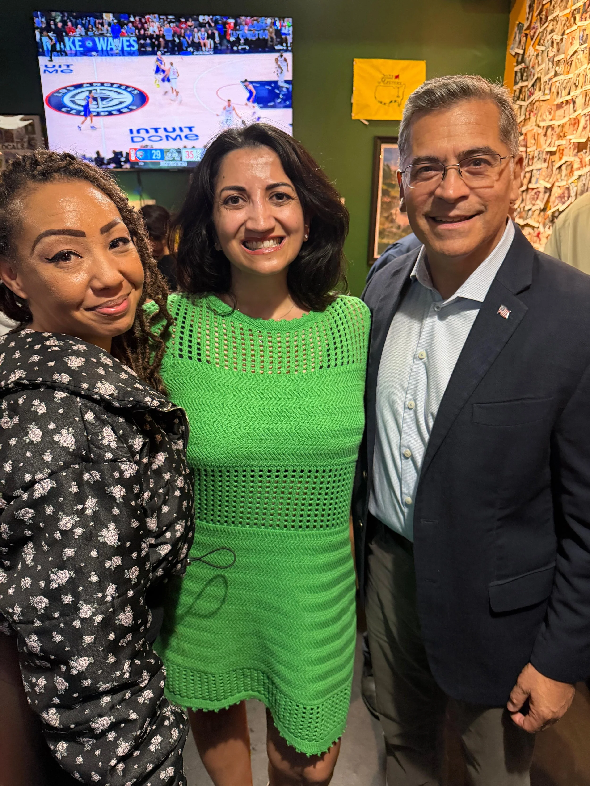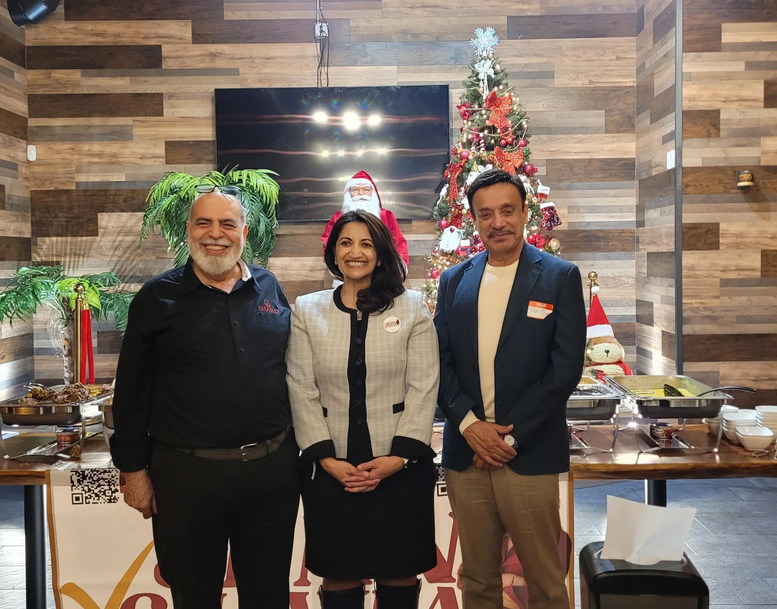 Three individuals posing for a photo at a social or professional event in a warmly decorated room, with other people in the background.