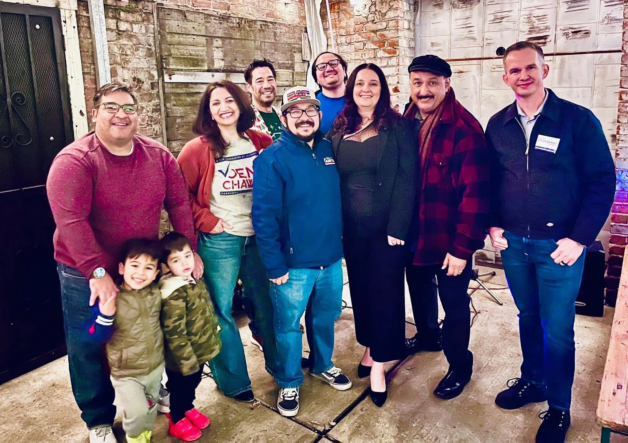 A group of nine people standing indoors, smiling at the camera, in a room with large windows and natural light.