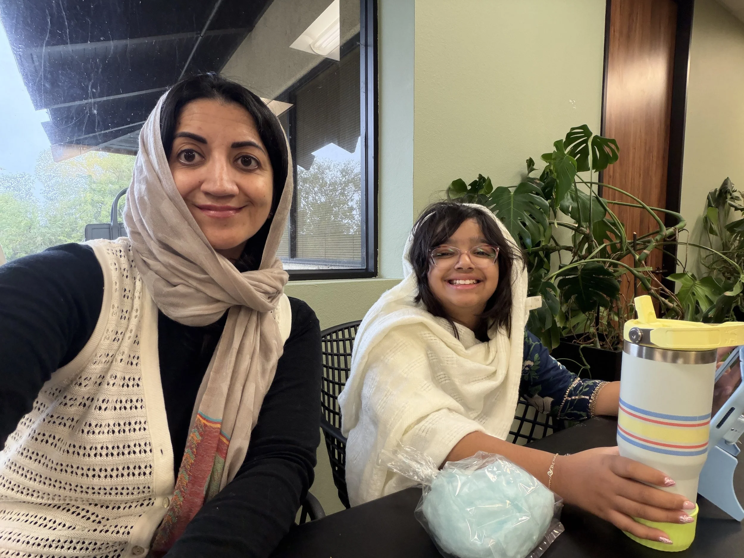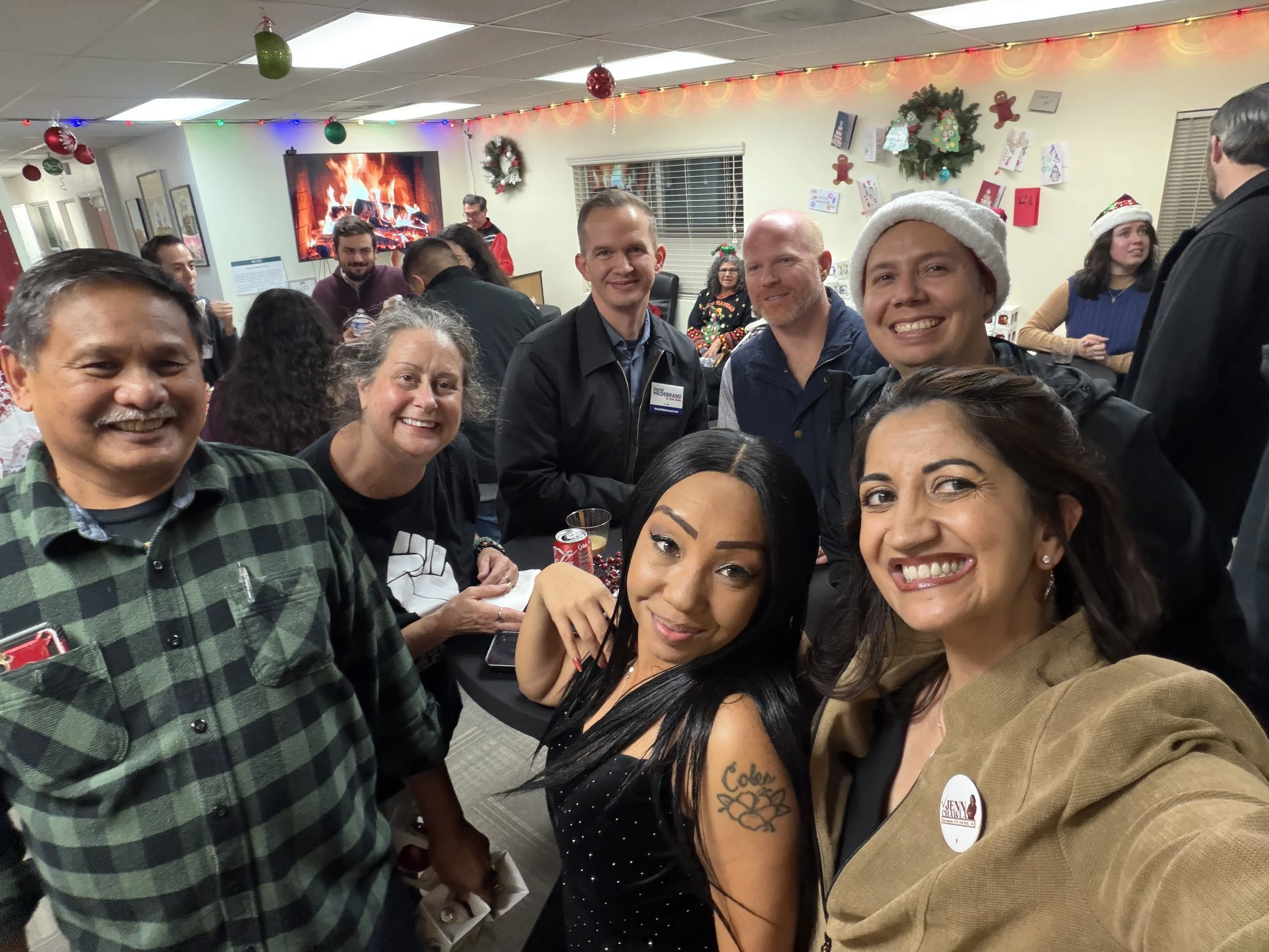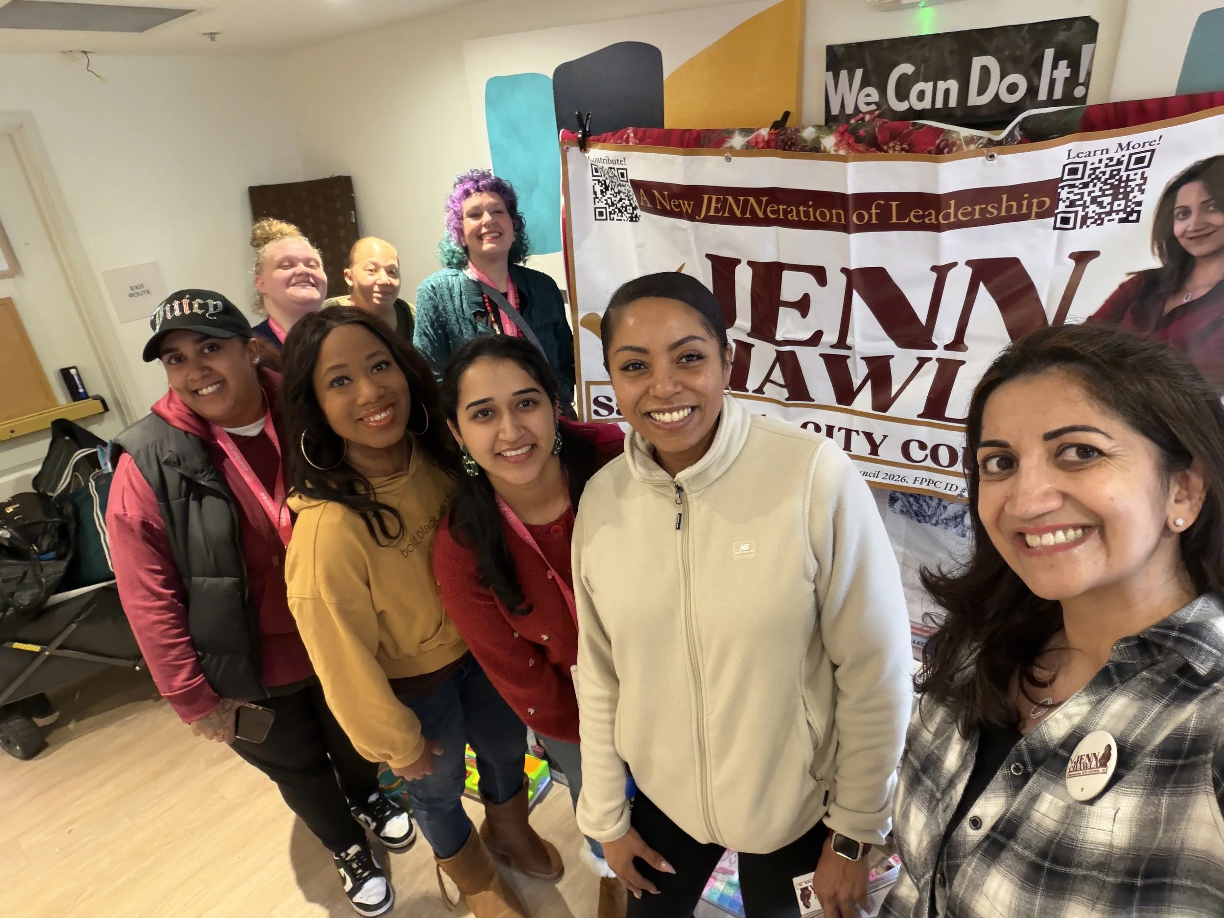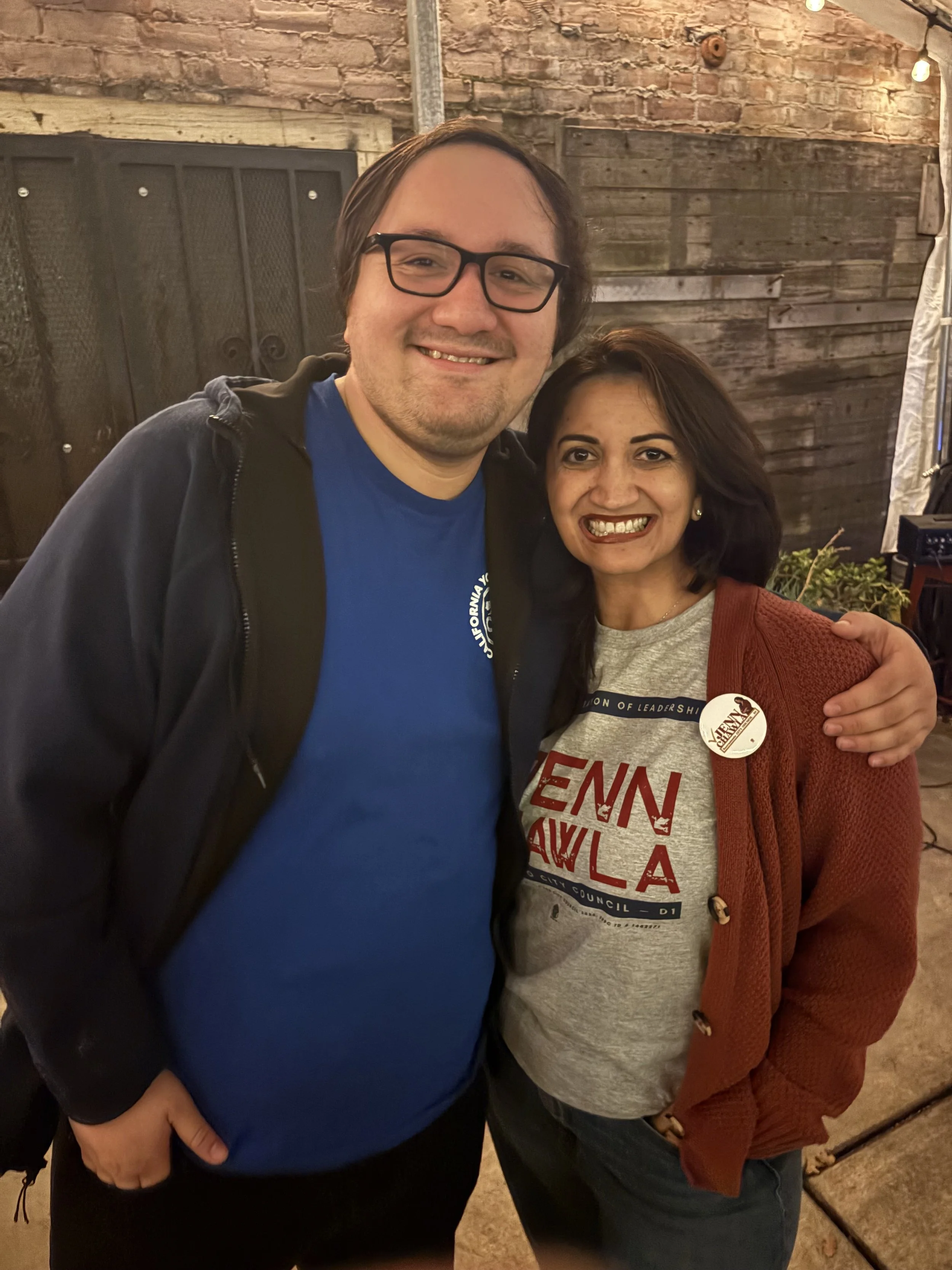 Two women smiling for a selfie in a room with posters and signs on the wall. One woman has dark hair and wears a floral sleeveless top, the other has short dreadlocks and wears a red blazer with a button.