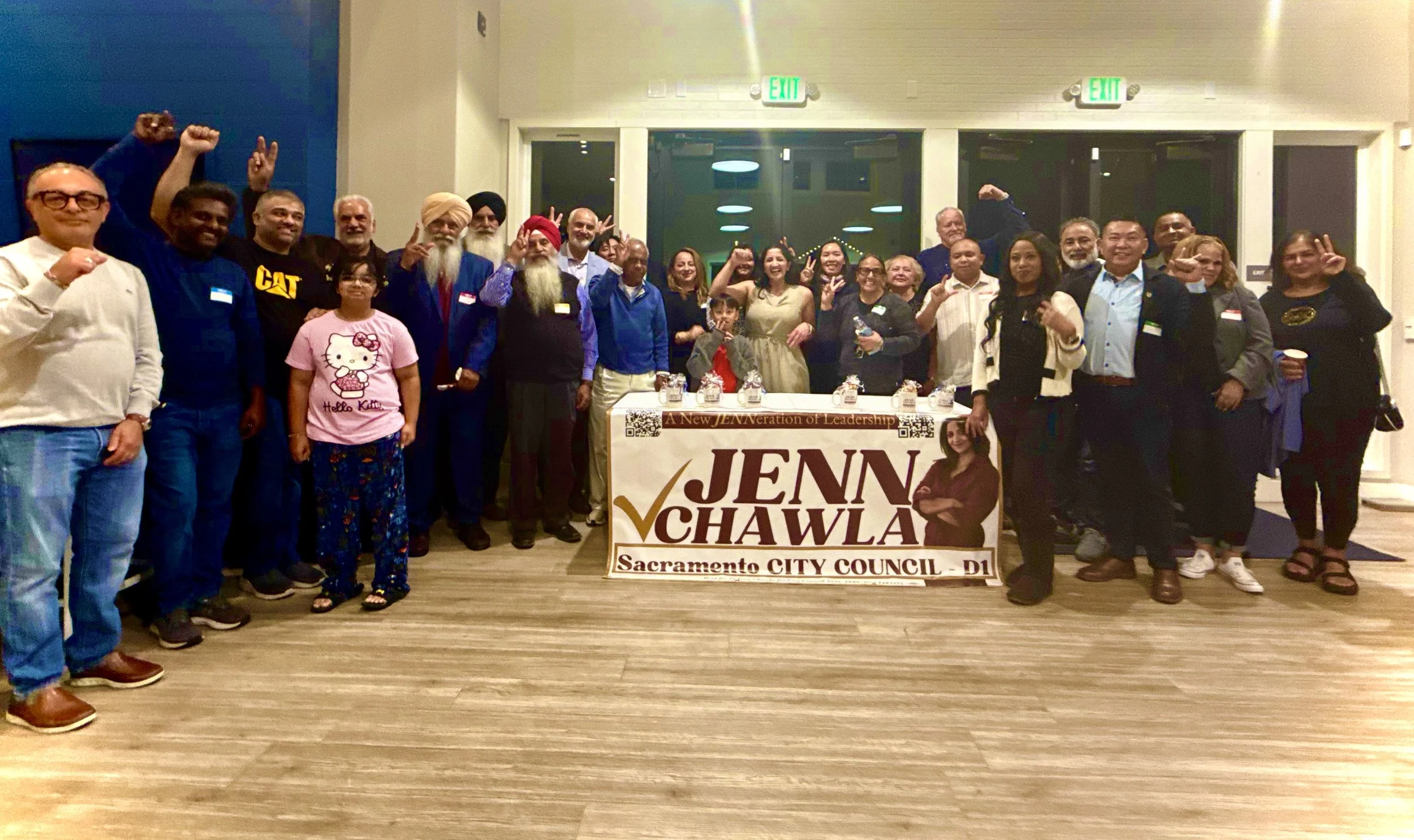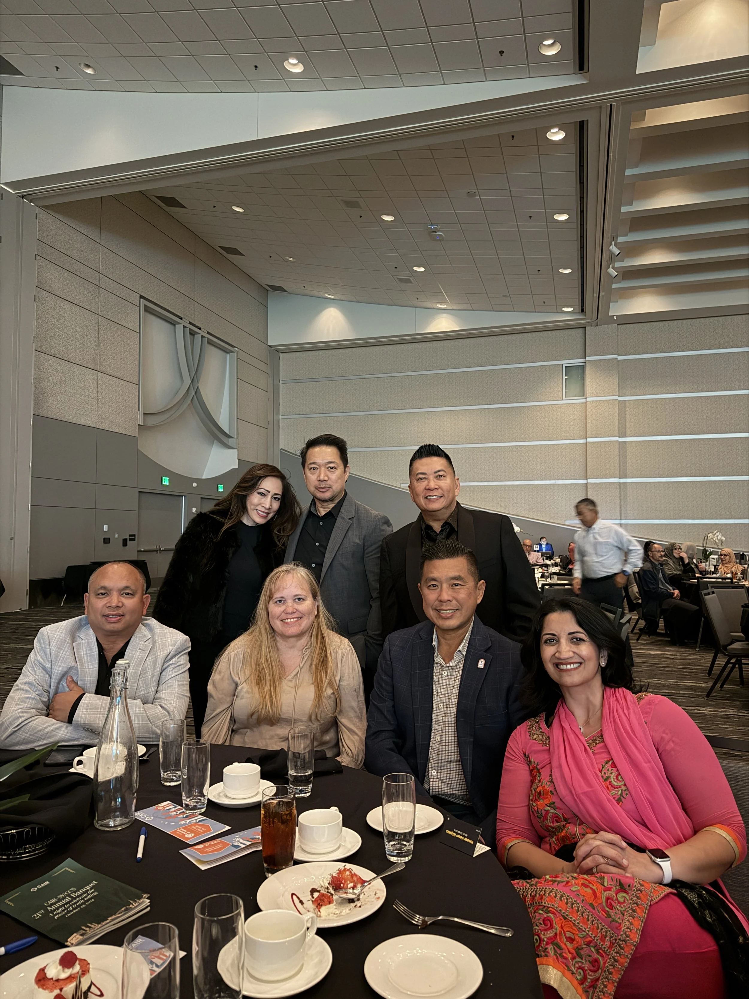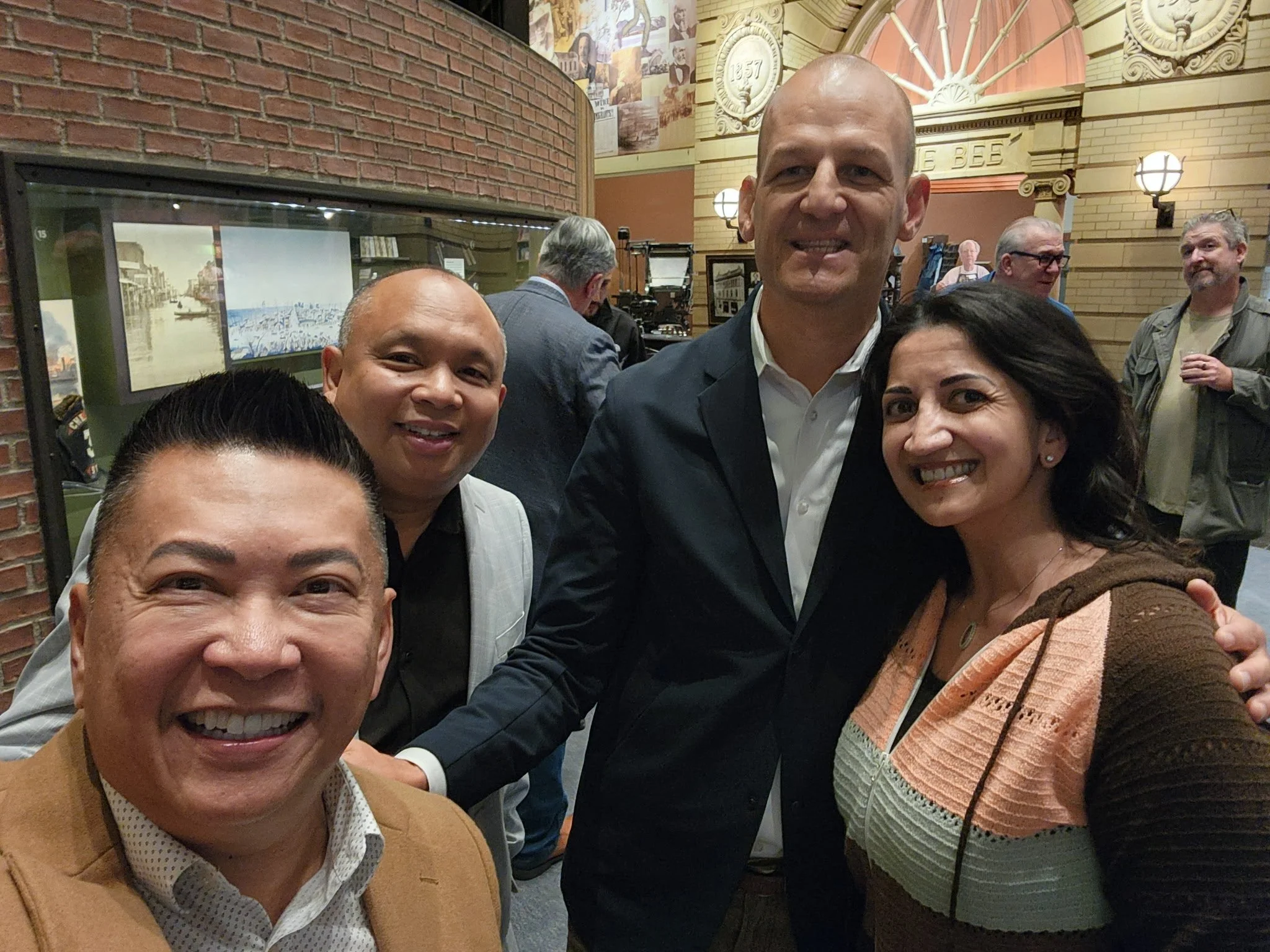 Four people standing in front of a backdrop with the logo of the Natomas Chamber of Commerce, smiling for the camera.