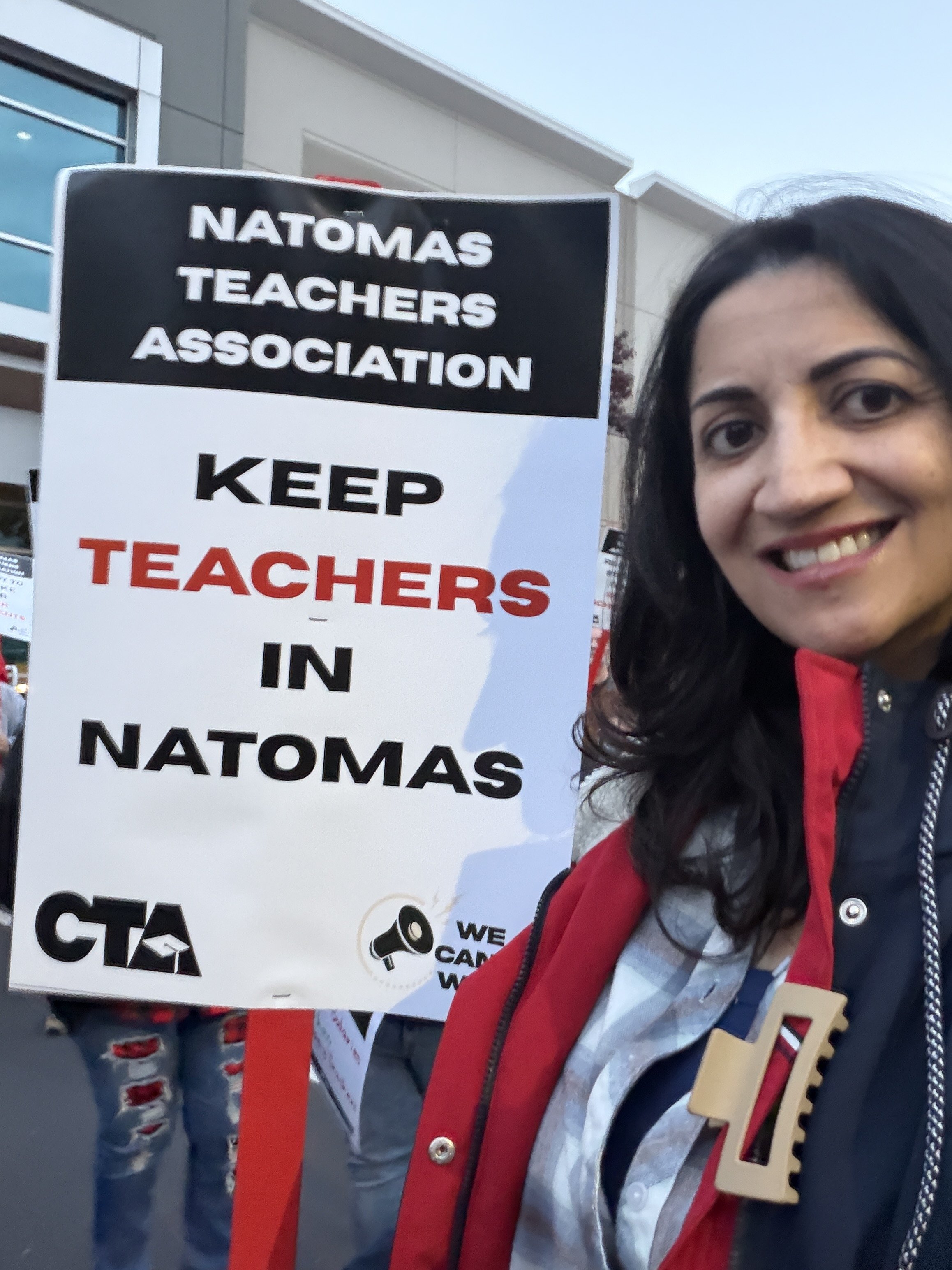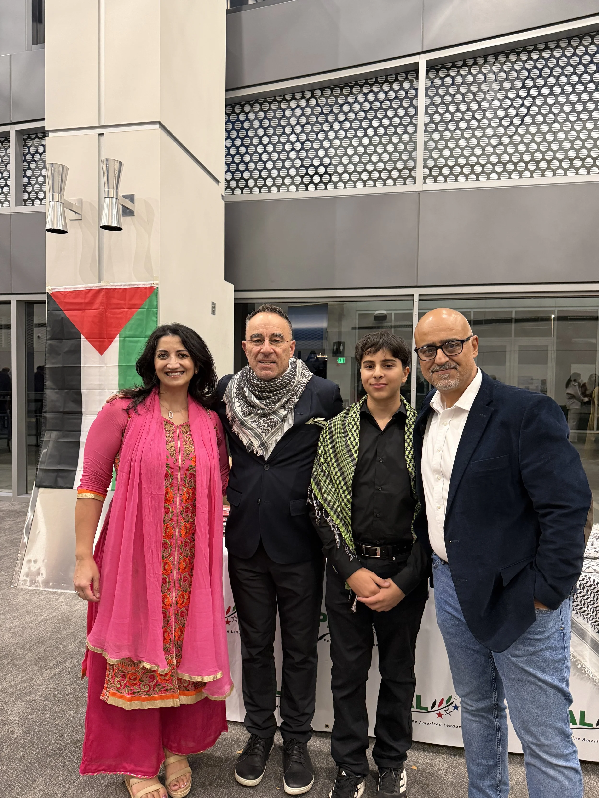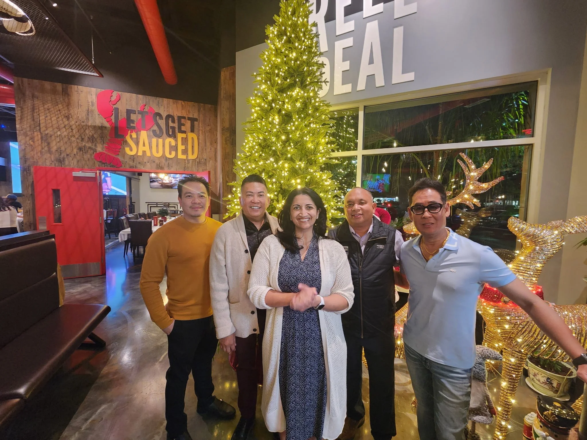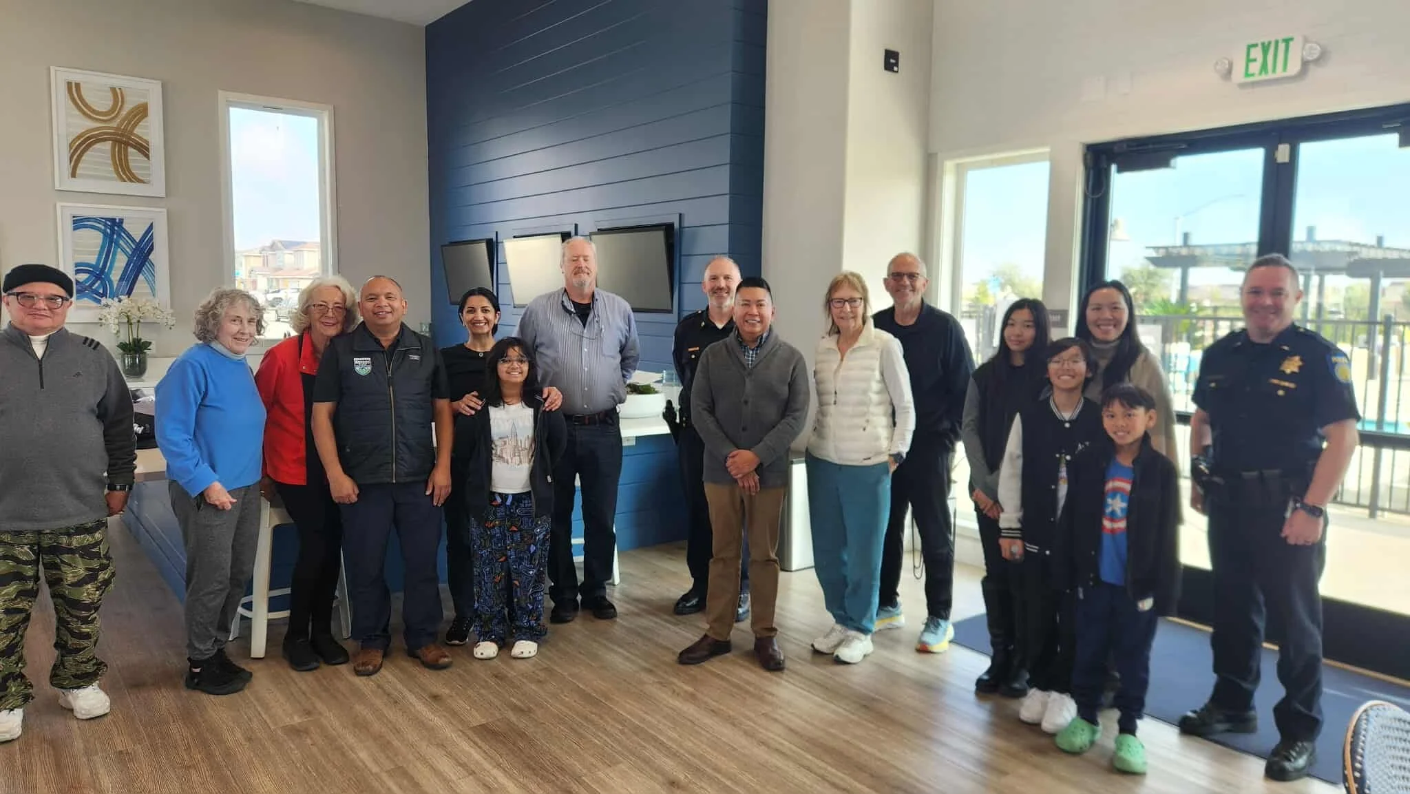 Four people standing in front of a backdrop with the logo of the Natomas Chamber of Commerce, smiling for the camera.