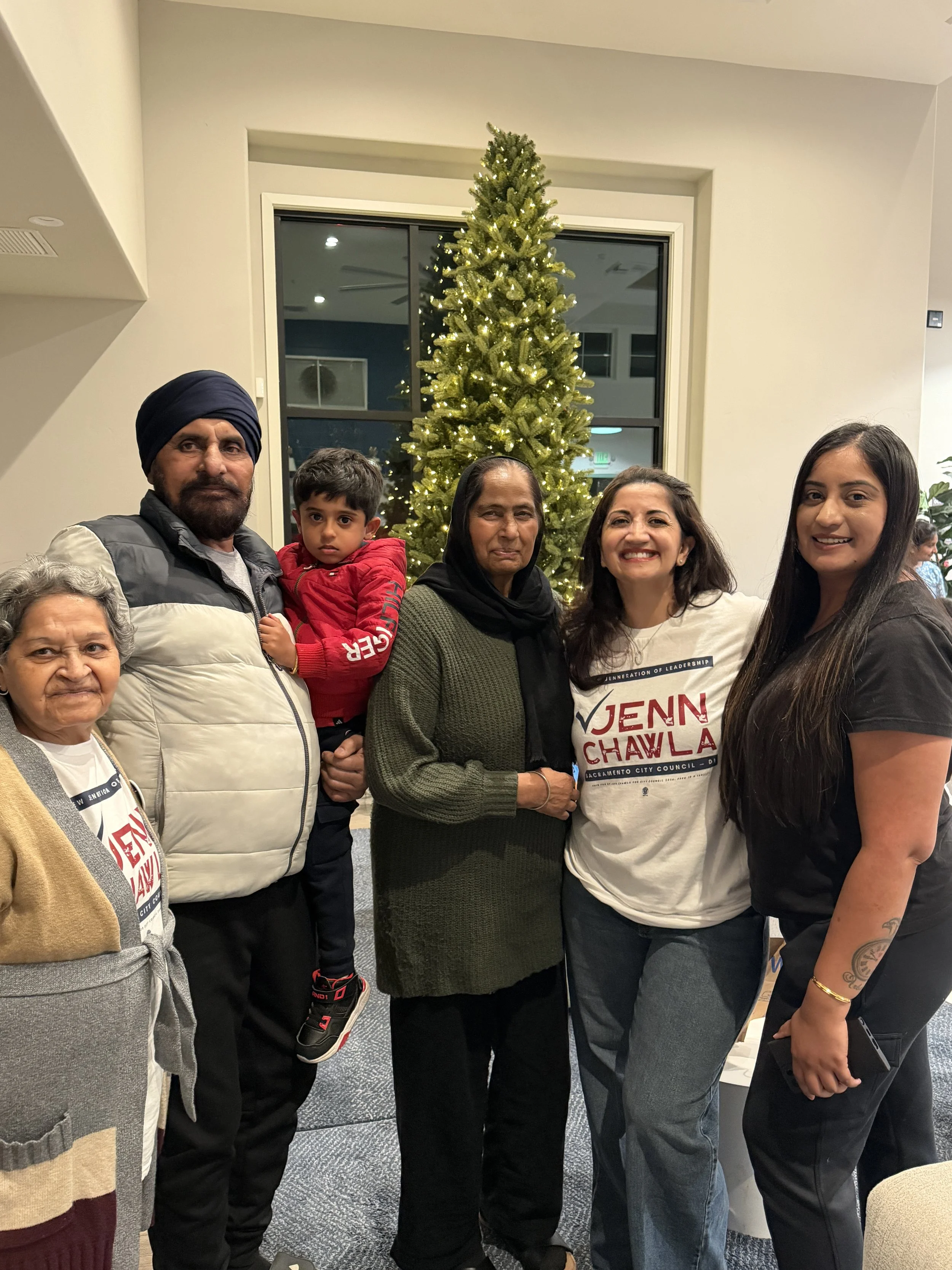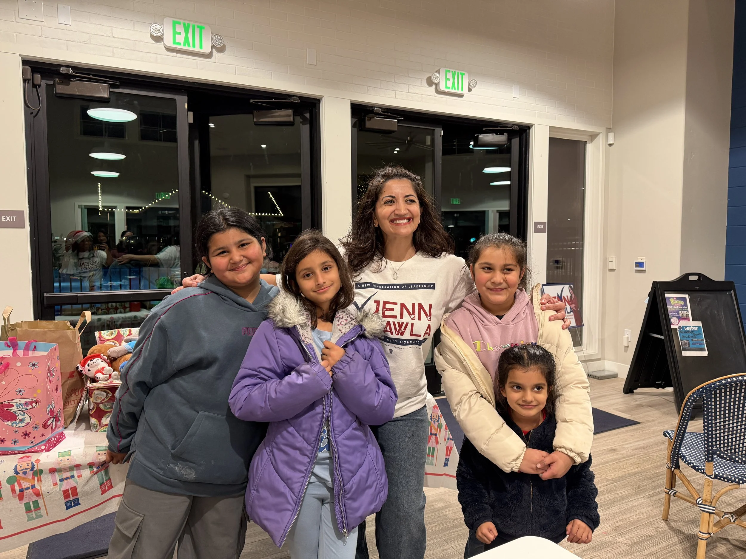Four women and a young boy are standing together outdoors at a community event, smiling for the camera. They are wearing sunglasses, and there are tents and other people in the background.
