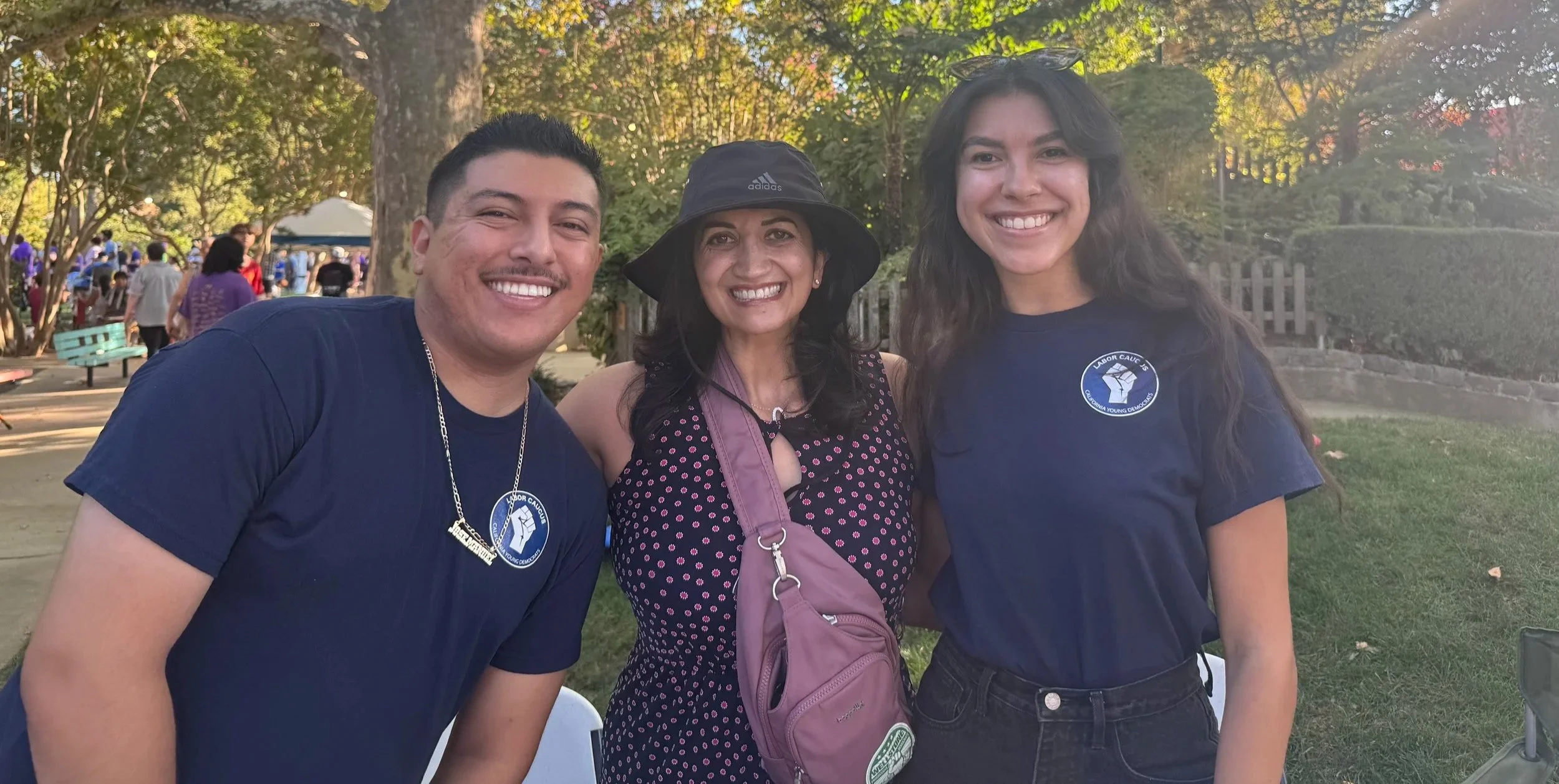 Three people smiling and posing together inside a store or cafe, with a glass door and outdoor parking visible in the background.