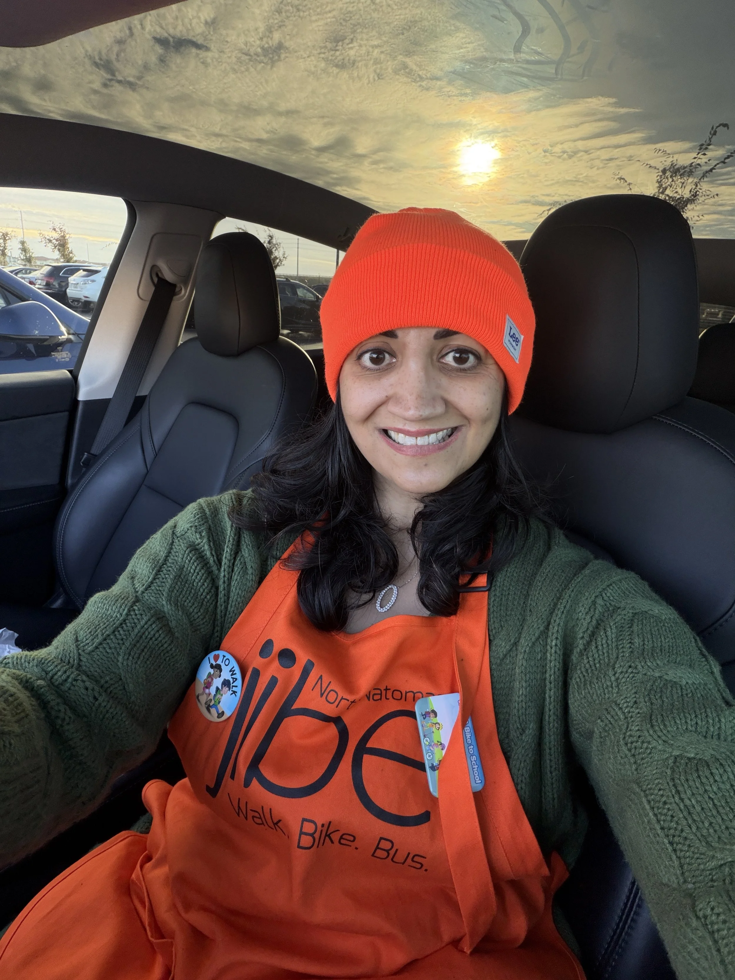 Woman taking a selfie in front of a mobile blood donation truck, smiling, wearing sunglasses, a black top, and a purple sash.