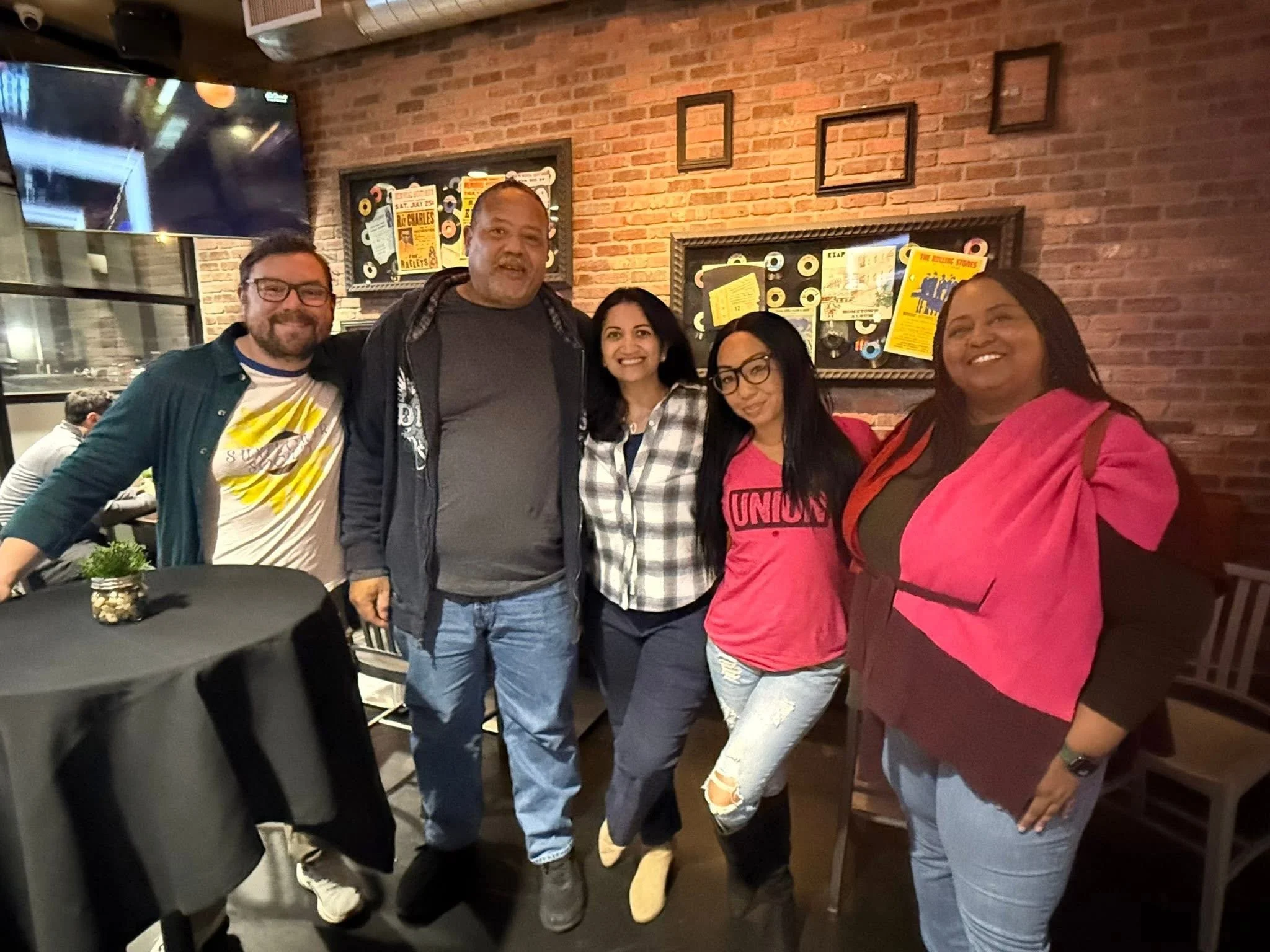 A group of four diverse people smiling at an outdoor event, with tents and trees in the background.