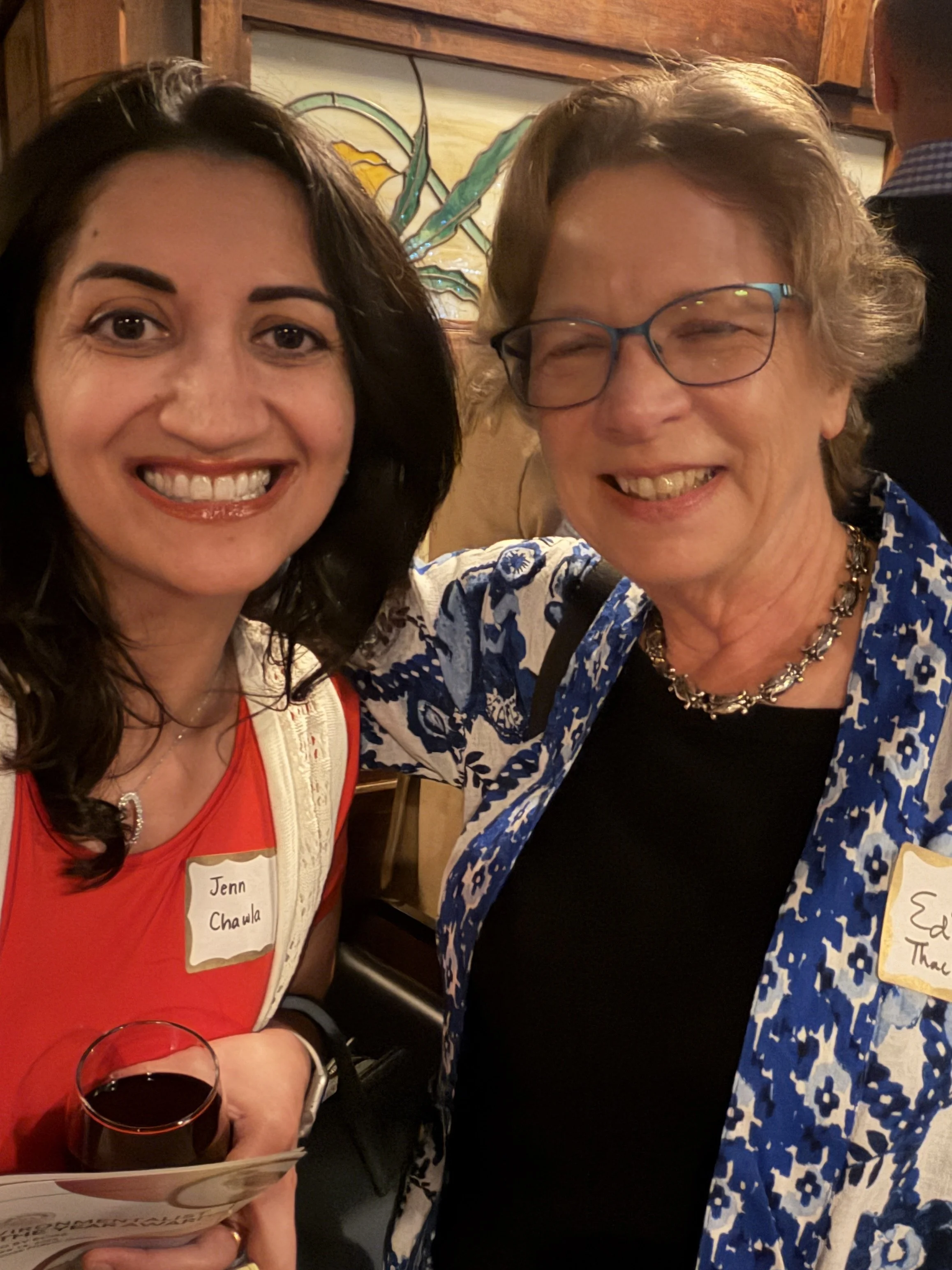 Two women standing indoors, smiling for a photo. The woman on the left has dark hair, wears a striped, button-down dress with a drawstring waist, and sandals. The woman on the right has gray hair, wears glasses, a light-colored blazer over a purple top, and white pants. There is a large yellow wall behind them and a whiteboard with text on the right side of the image.