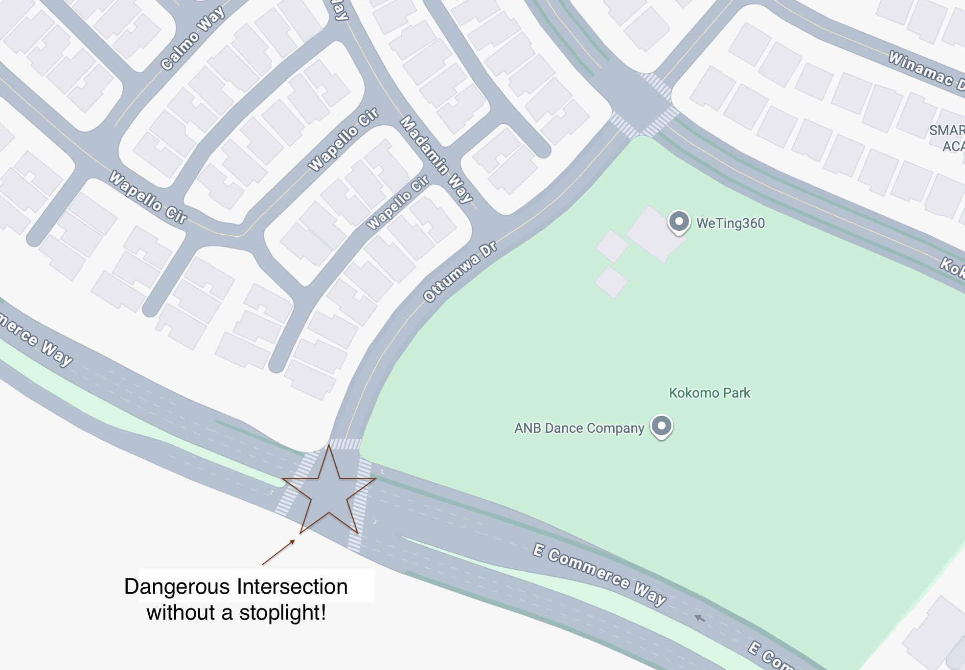 One clear example is the intersection of E Commerce Way and Ottumwa Drive, which residents have raised concerns about for years. Despite heavy traffic and pedestrian activity near Kokomo Park and surrounding neighborhoods, this intersection still lacks the stoplight needed to properly manage traffic flow and protect drivers, cyclists, and pedestrians.